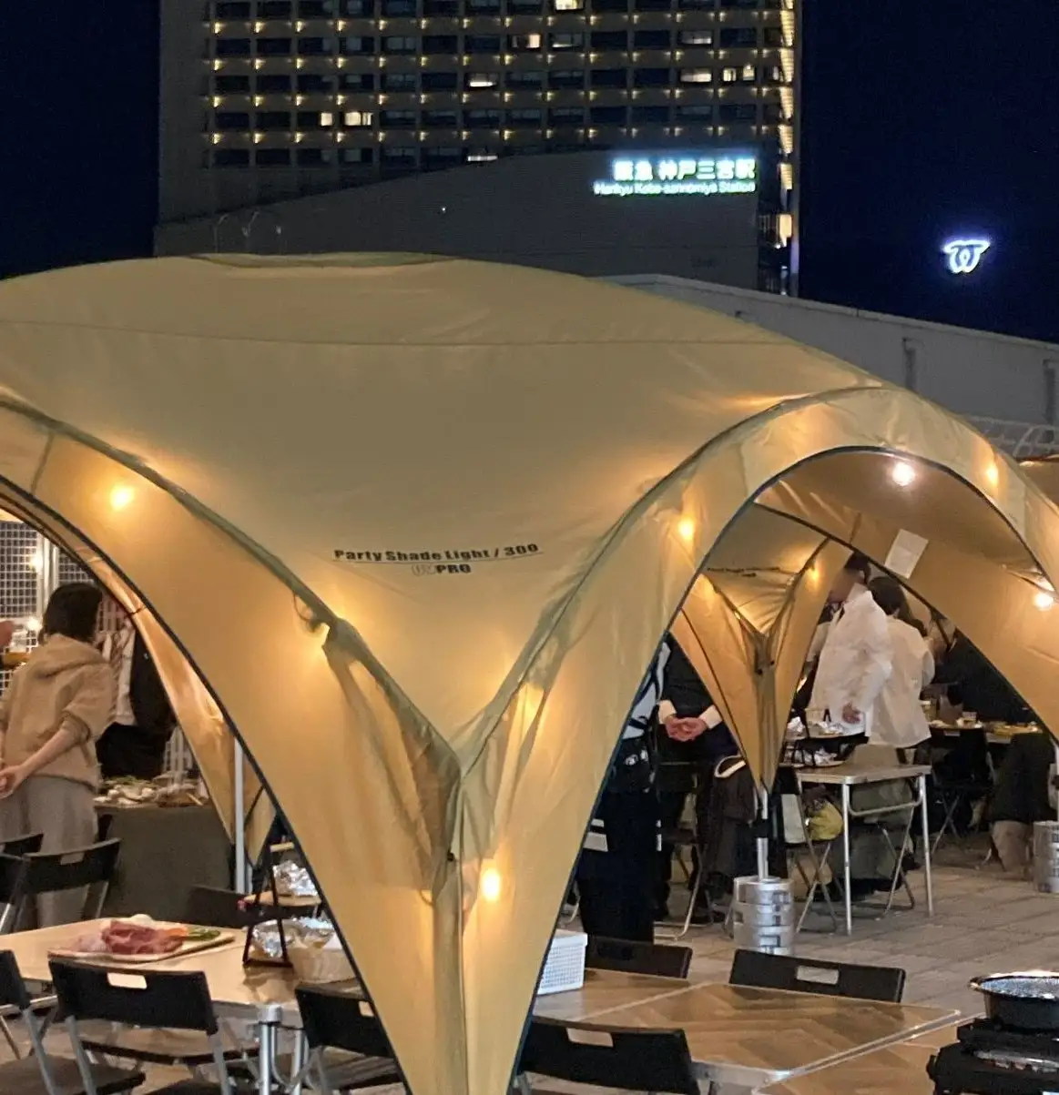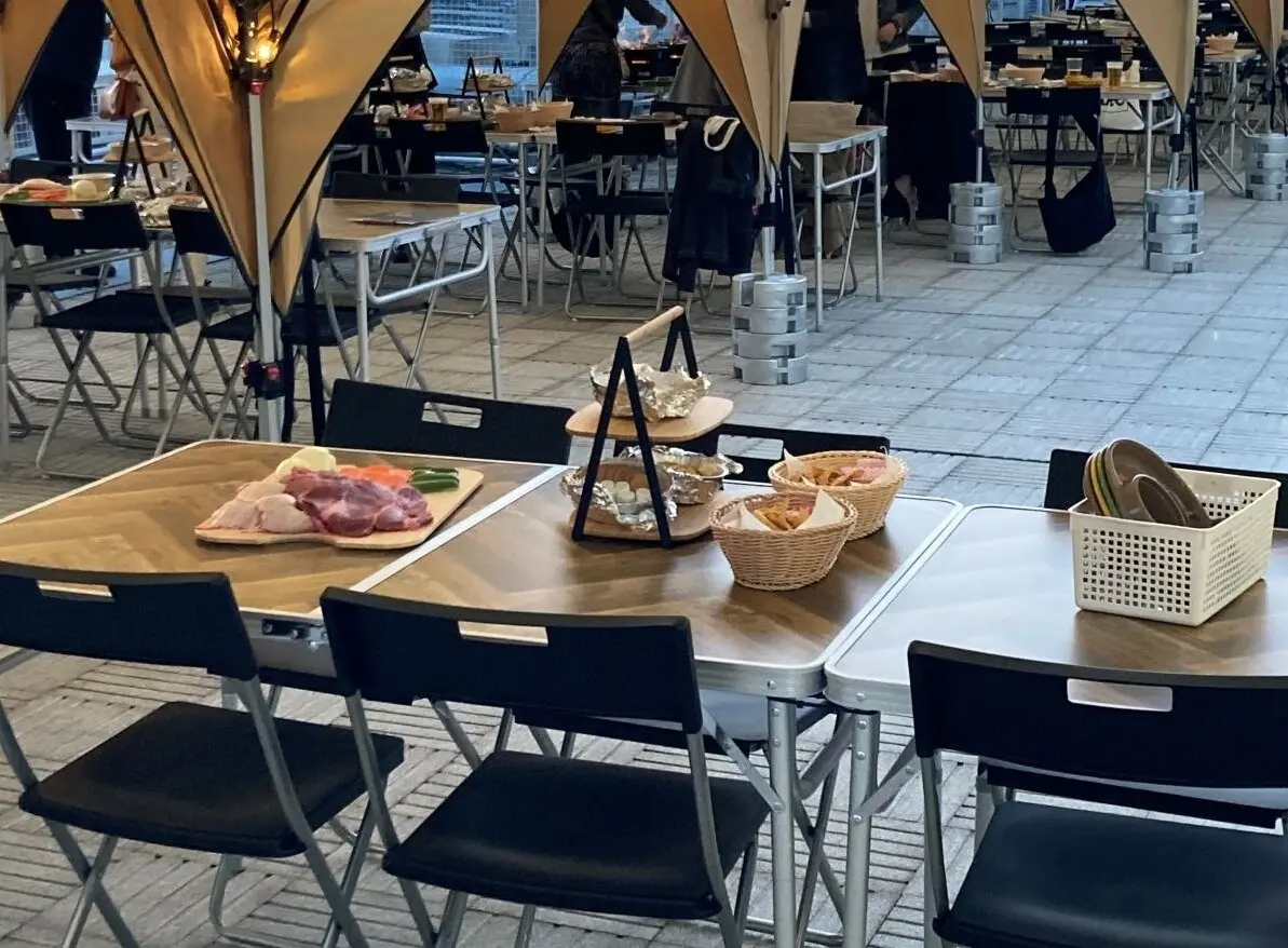 ・日差しや雨よけのテントを設置した全天候型のBBQビアガーデンです。