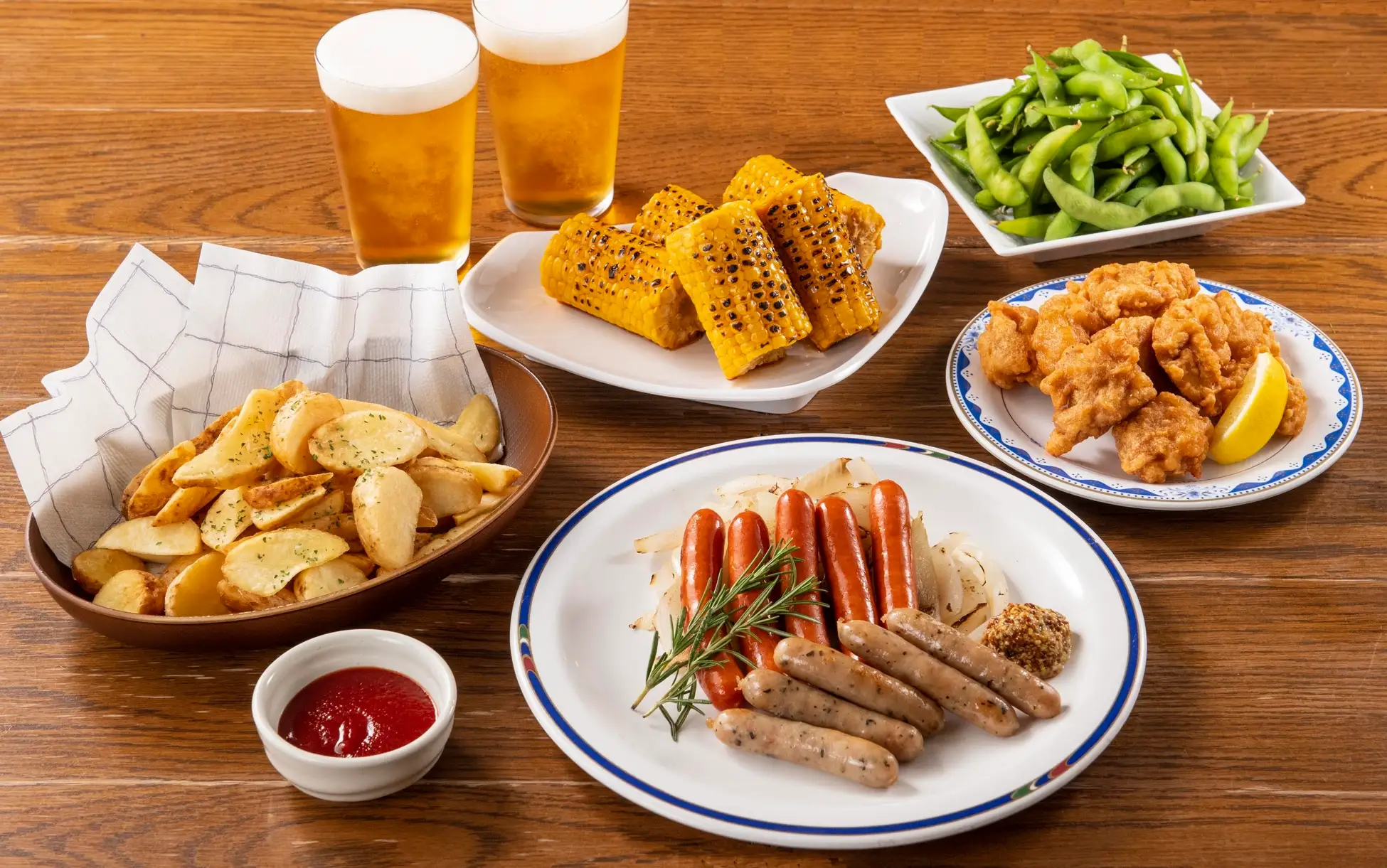 ●枝豆 ●焼きとうもろこし ●フライドポテト ●唐揚げ ●ソーセージ盛り合わせ