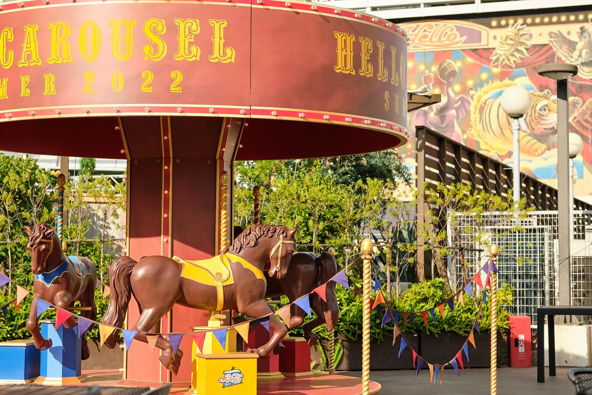 新宿駅の屋上とは思えない大きなメリーゴーランドを中心としたフォトジェニックなビアガーデン。多種多様なフォトブースや巨大なメリーゴーランドなど、アミューズメント感を楽しめる。もちろん写真も自由に撮影OK♪