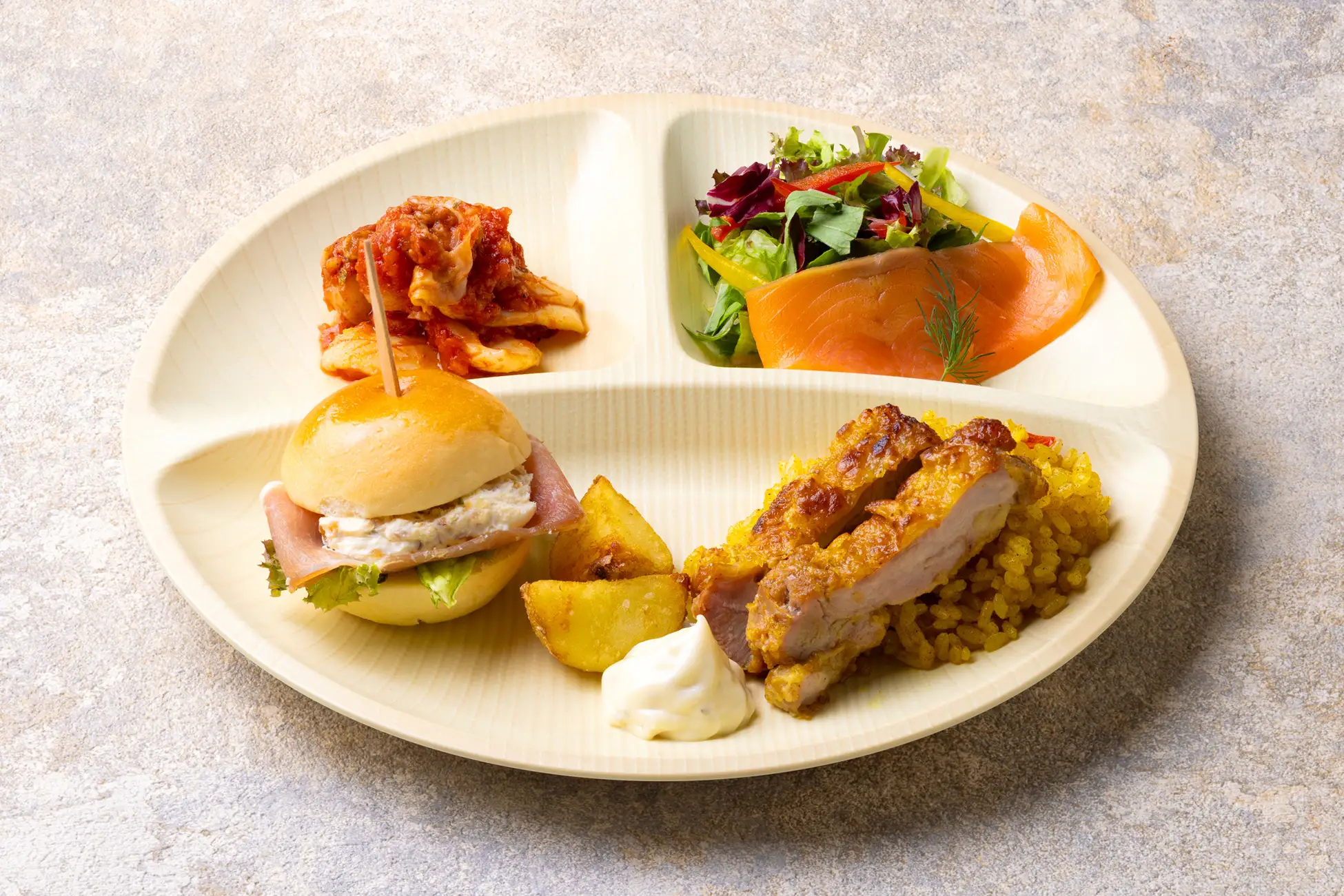 スタンダードプランの料理は、前菜・スパイスチキン・プチバーガー・フライドポテト・ガーリックシュリンプ・カレーピラフなど、食べ応えのある料理を彩りよく盛り合わせた温製/冷製プレートをお1人様ずつご提供するスタイル。
