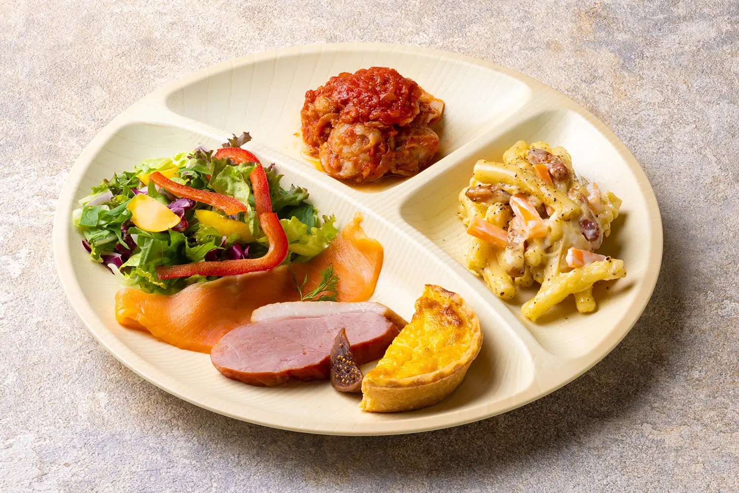 魚介の冷製チリソースマリネ/マカロニベーコンサラダ ブラックペッパー風味/彩りサラダ/スモークサーモン/合鴨の燻製/コーンとオニオンのキッシュ