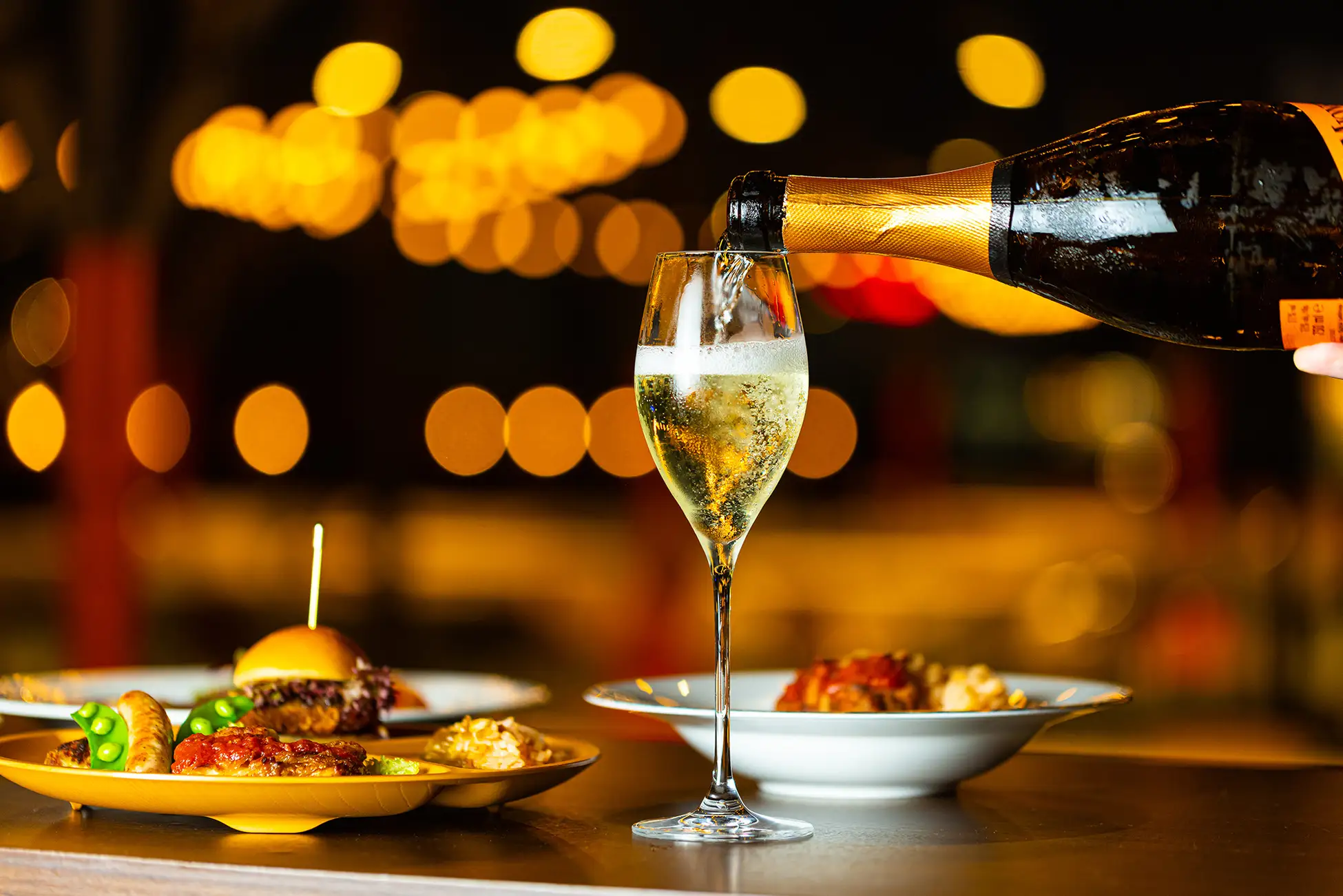 サンセットから夜景へとうつろいゆく美しい景色と心地よい風を感じながら、冷えたビールで喉を潤す贅沢な時間を楽しめる。