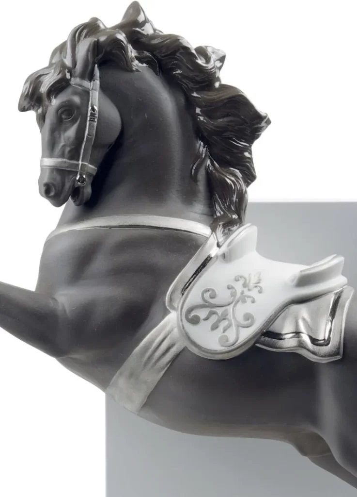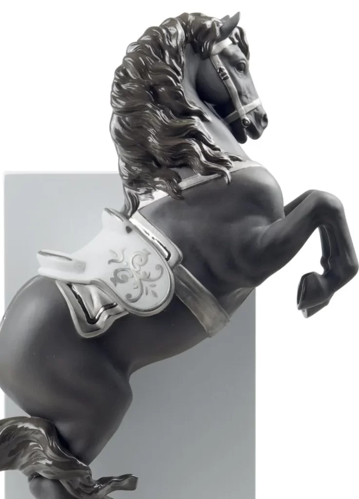 アンダルシア純血種の馬が表現されており、イギリス馬よりも丸みを帯びた独特の体型が特徴です。リヤドロの馬をテーマとした他作品と異なり、本作では古典馬術のコンセプトにしたがいサドルをはじめとする馬具を装飾し、騎手はいないながらも馬は馬術のポーズで表現されています。